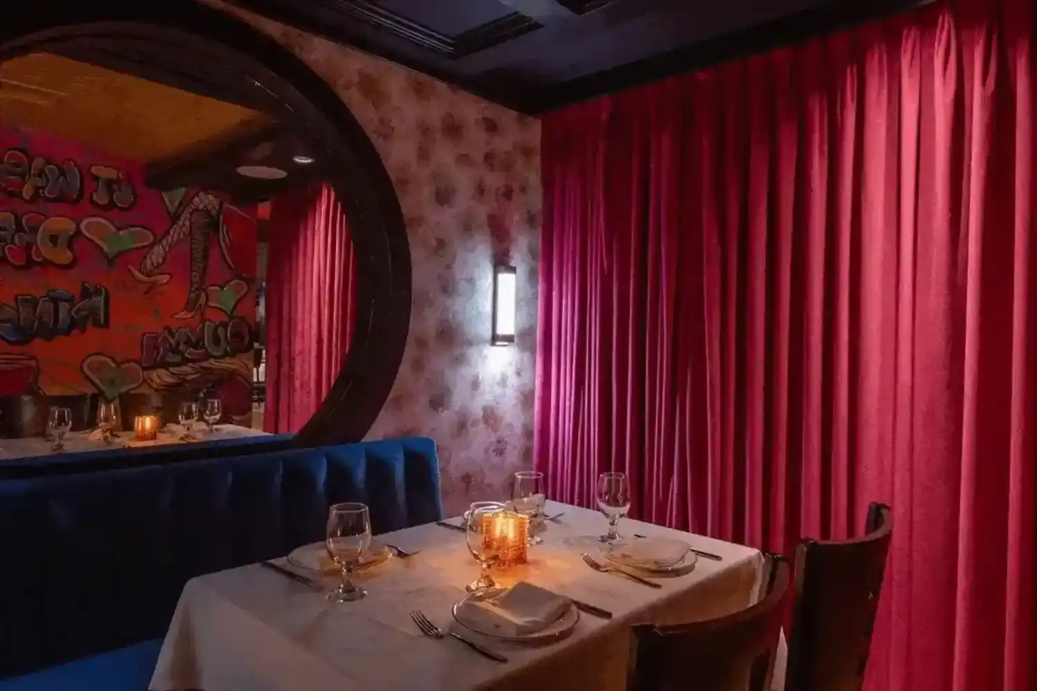 Artwork and murals are integrated architecturally rather than treated as decoration. They are scaled to the room, positioned to align with sightlines, and framed by lighting that changes their presence as the night progresses. These pieces act as emotional punctuation points, grounding the space in narrative without overwhelming it. The art does not compete with the diners. It observes them.