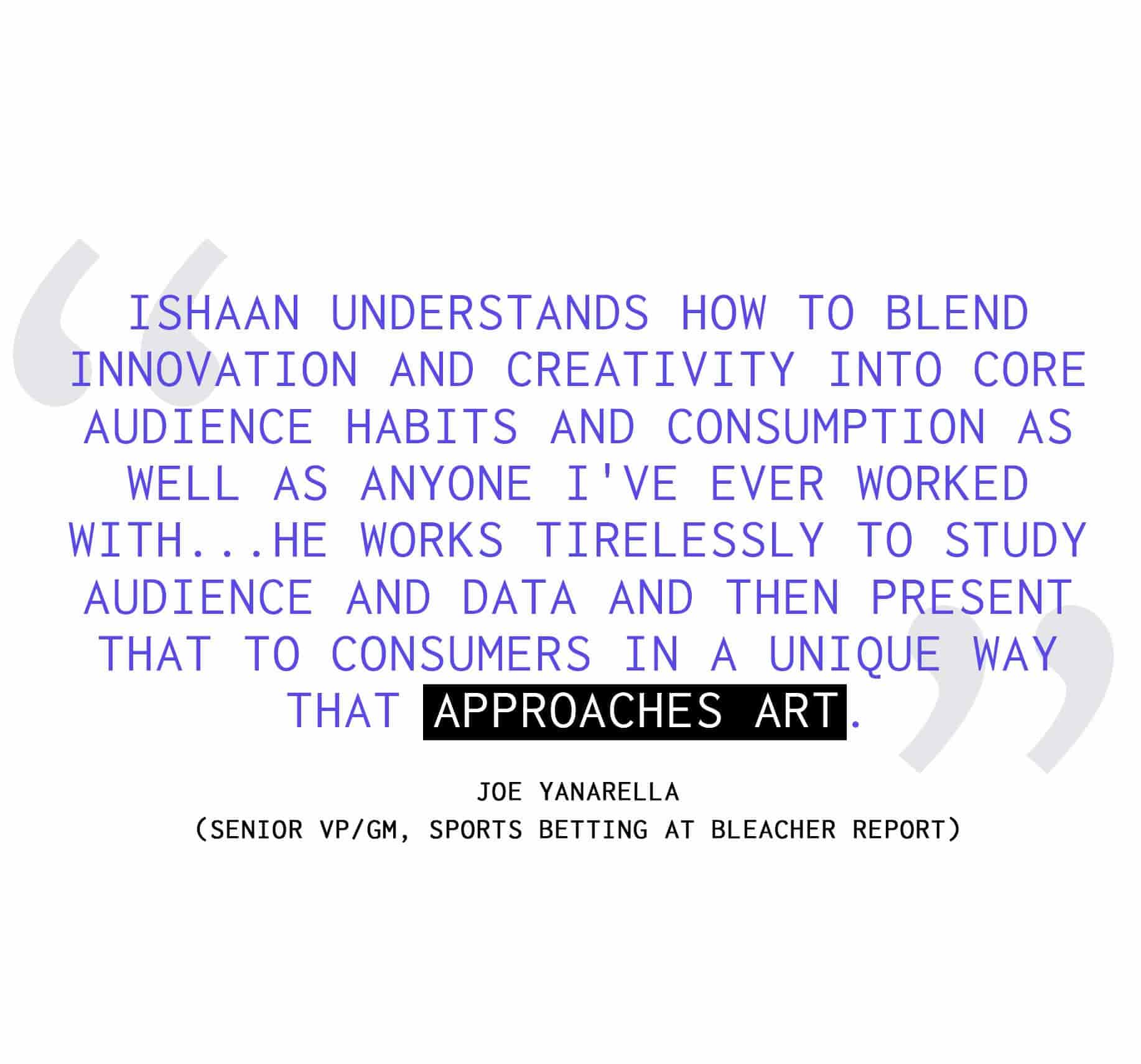 Towards the end you can also hear the General Manager of House of Highlight and then the leader of our programing team efforts Doug Bernstein discuss the voice that we would look to develop on each platform and how this would be achieved. The social moments team was a big bet for Bleacher Report and I was tasked with building out tools to scale the team and to create a playbook that could be replicated by new hires and producers that we could bring on. Here's what Joe had to say about my work on the team - "Ishaan understands how to blend innovation and creativity into core audience habits and consumption as well as anyone I've ever worked with. Whether it's looking at highlight treatments through a different lens or modernizing a basic interview format by having someone interview their younger self, he works tirelessly to study audience and data and then present that to consumers in a unique way that approaches art." - Joe Yanarella