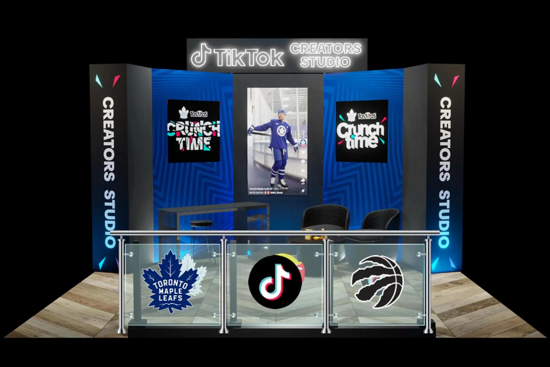 The TikTok Creator Studio at Scotiabank Arena was a 12x10 concourse installation designed to bring content creation, fandom, and live sports closer together during select Raptors and Maple Leafs games. It was a modular environment built for dual-brand activation, featuring a fabric wall skin that could switch seamlessly between team colors and partner brands like Ruffles and Tostitos. The setup included neon TikTok signage, branded glass panels, and a central portrait-mode display that streamed live content and interactive creator moments to fans in the arena and beyond. Each night, it served as the physical hub for shows like “Crunch Time,” “Kick Back,” and “Creator Post Up,” merging the excitement of game night with real-time digital storytelling.
