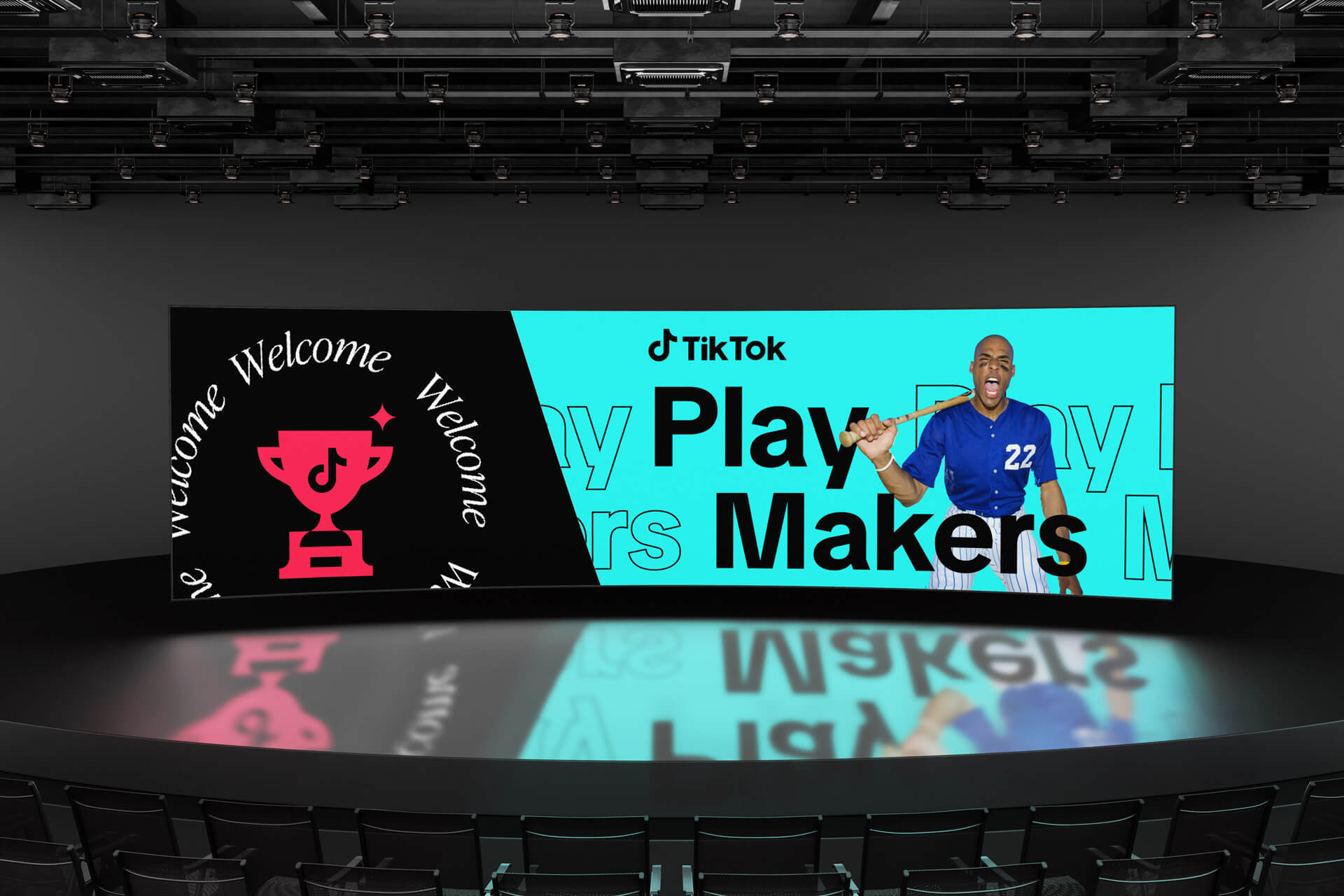 I was brought in to lead the creative direction and environmental design for the space, working with our Canadian team and agency partner Decor & More in shaping its look, feel, and storytelling rhythm. My focus was to make the studio both visually magnetic and highly functional, balancing creator needs with the elevated tone of a major sports arena. I oversaw layout strategy, lighting mood boards, signage hierarchy, and the integration of reflective and branded materials to channel the energy of the TikTok ecosystem within a premium live environment. The visual system adhered closely to TikTok’s brand guidelines, with a consistent use of motion-inspired geometric patterns, bold color blocking, and the iconic note logo placed in focal zones to anchor the brand presence. The seating layout was designed to create intimacy and flexibility for hosts, guests, and talent filming short-form content on site, allowing the space to shift easily between interviews, live segments, and fan engagement moments. The result was an environment that felt cohesive, on-brand, and purpose-built for creators, athletes, and fans to share the same storytelling stage.