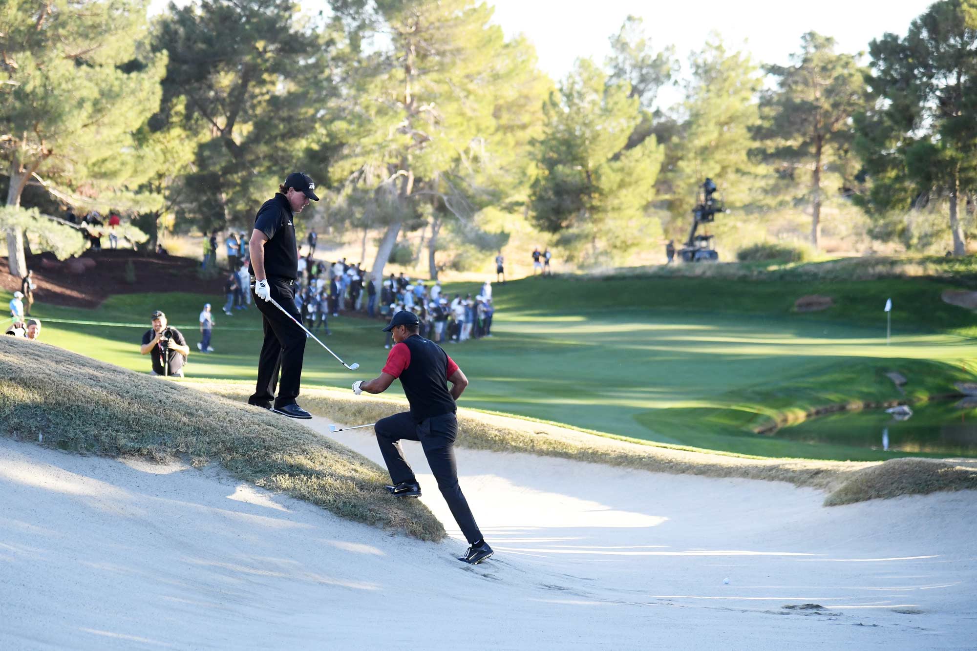 By the thirteenth hole the match had developed a steady tension that was noticeable across the broadcast. The players moved deliberately through the fairway while commentators discussed the long competitive history between the two golfers. Both men had spent decades competing on the same stages, yet moments like this where they faced each other alone were rare. Each shot felt like a small chapter in a rivalry that had stretched across an entire era of professional golf. The environment of Shadow Creek added to the sense of isolation and focus. With no large tournament field around them, the contest felt almost private despite the millions watching. The hole reinforced how unusual the format truly was and how interesting this experimental format was in the first place.