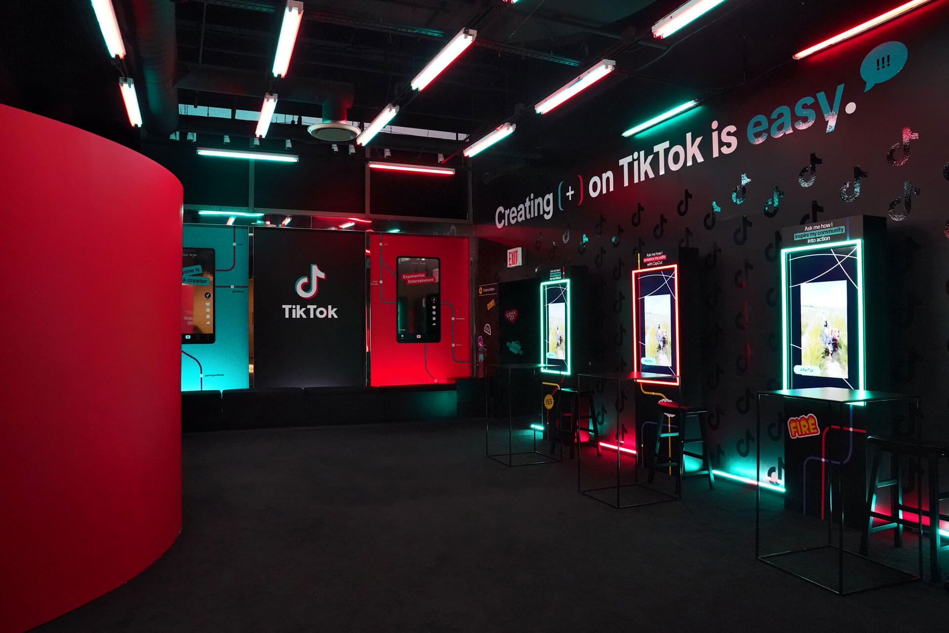 Our entry experience needed a clear heartbeat, so we anchored the floor with a luminous TikTok mark that worked as sculpture, beacon, and photo magnet. It set the tone for the entire space, gave visitors an instant shareable moment, and quietly solved wayfinding by pulling people toward the center before they explored the zones around it.