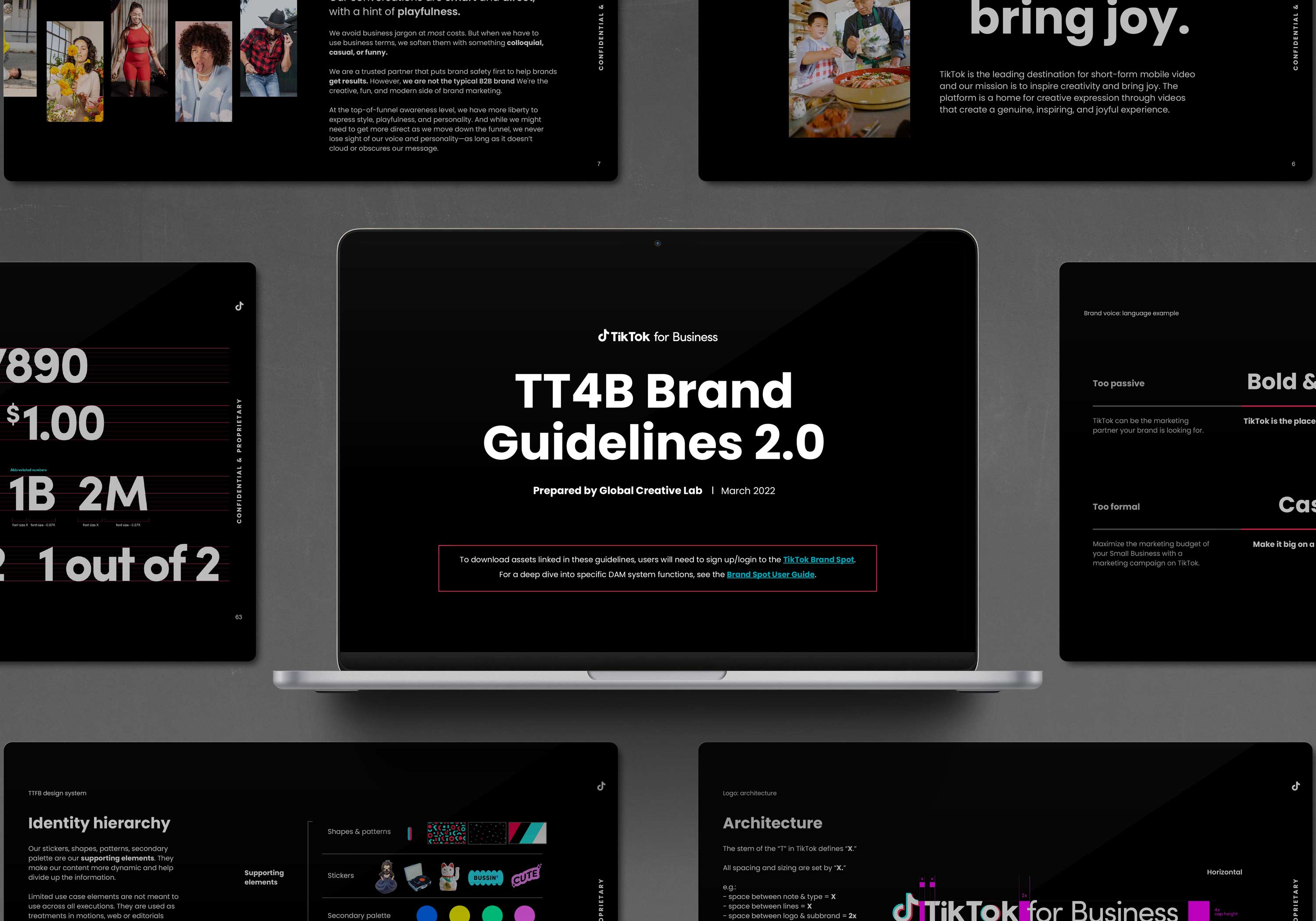 When I joined TikTok, the company was scaling faster than its brand infrastructure could support. The platform had already won with creators and Gen Z, but the visual system needed to mature to meet enterprise partners, new product surfaces, and global markets. I led the buildout of a modular, governance-ready brand system for TikTok for Business while partnering with Wolff Olins and our consumer-side Creative Lab to align on one global source of truth. My scope included typographic hierarchy, layout and grid logic, motion behaviors derived from the upward swipe, and an accessibility-first color architecture designed to perform across screens and real-world environments. We approached the guidelines as an operating system, not a static rulebook, so teams could move fast without fragmenting the brand. To drive adoption, I built practical enablement tools like deck templates, data visualization standards, sticker and GIF libraries, and event franchise playbooks. This created a shared language across Product, Marketing, Sales, and regional teams while still allowing local nuance. The outcome was a system that reduced production friction, improved consistency, and raised the craft bar across touchpoints. It helped TikTok show up with clearer authority everywhere, without losing the creator-first energy that made the brand culturally inevitable.