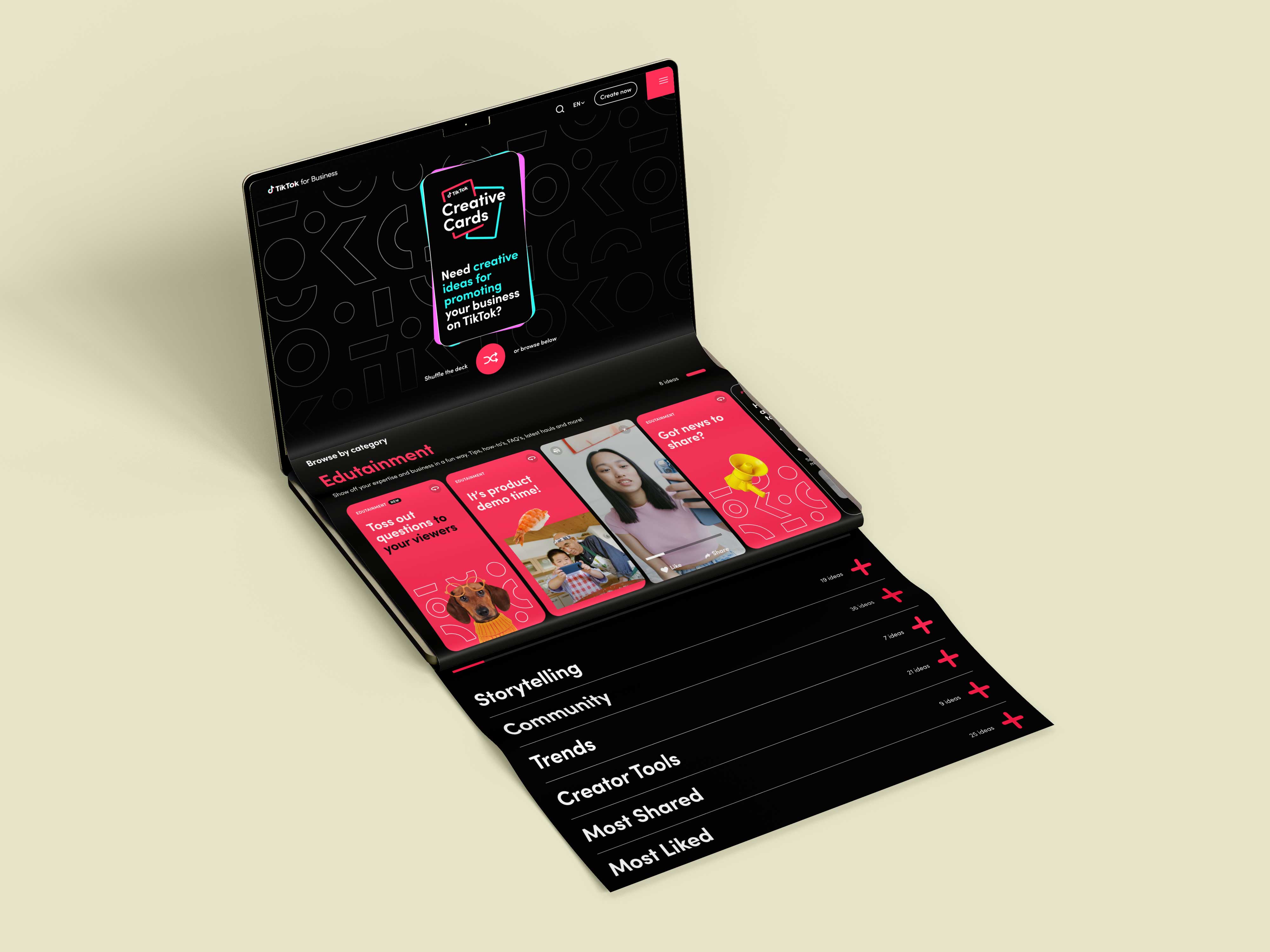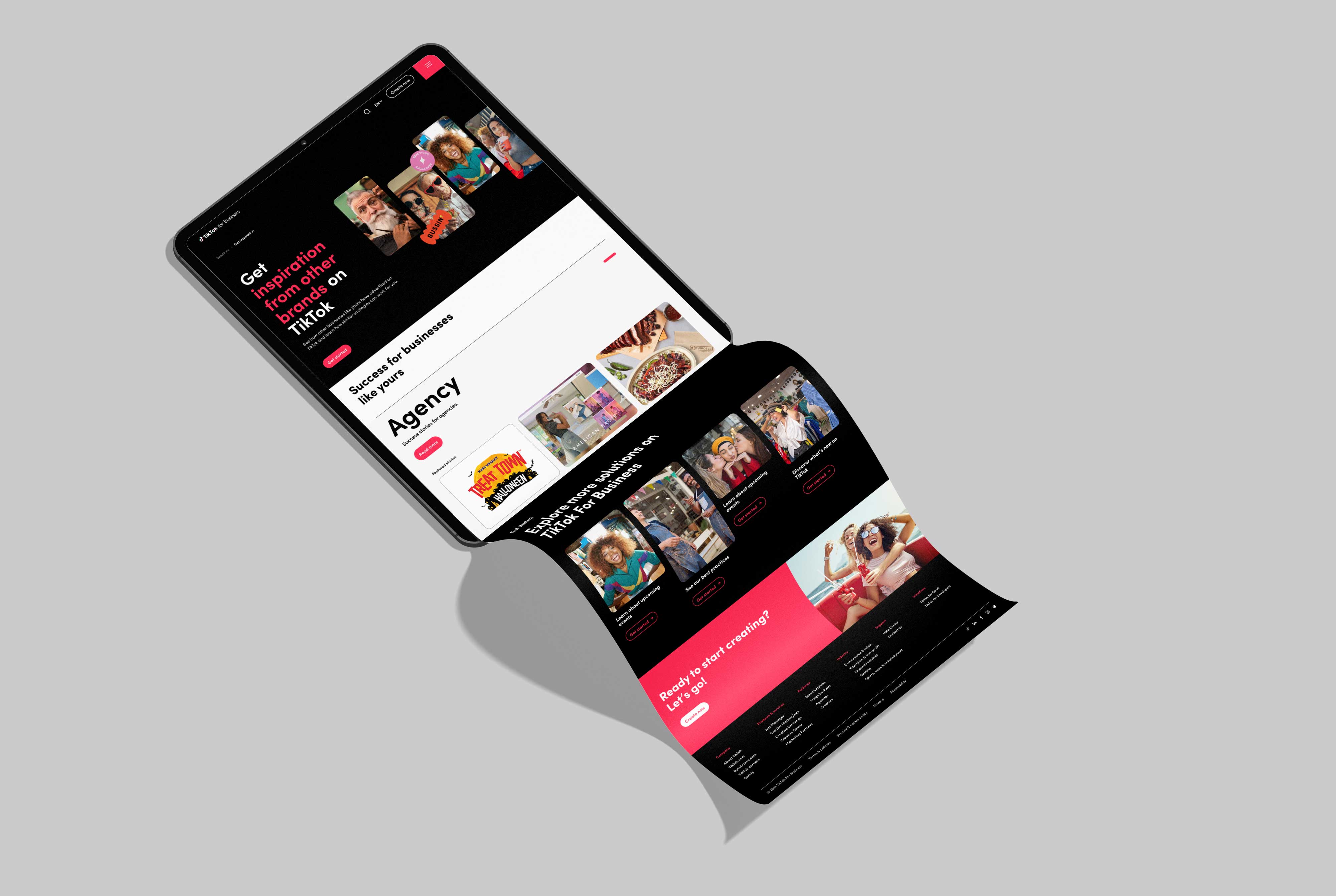 The final system embodied TikTok’s core ethos of authenticity, creativity, and self expression, translating the platform’s kinetic culture into a flexible yet unmistakable design language. We introduced expressive staggered headlines that favored rhythm over rigidity, paired with dynamic grid systems engineered for energy, variation, and rapid iteration across formats. The photography approach centered on real people and real moments, celebrating the breadth of the global TikTok community while avoiding overly polished tropes in favor of immediacy and relatability. On website, social, app and print as well as digital, all the elements needed to work together cohesively.