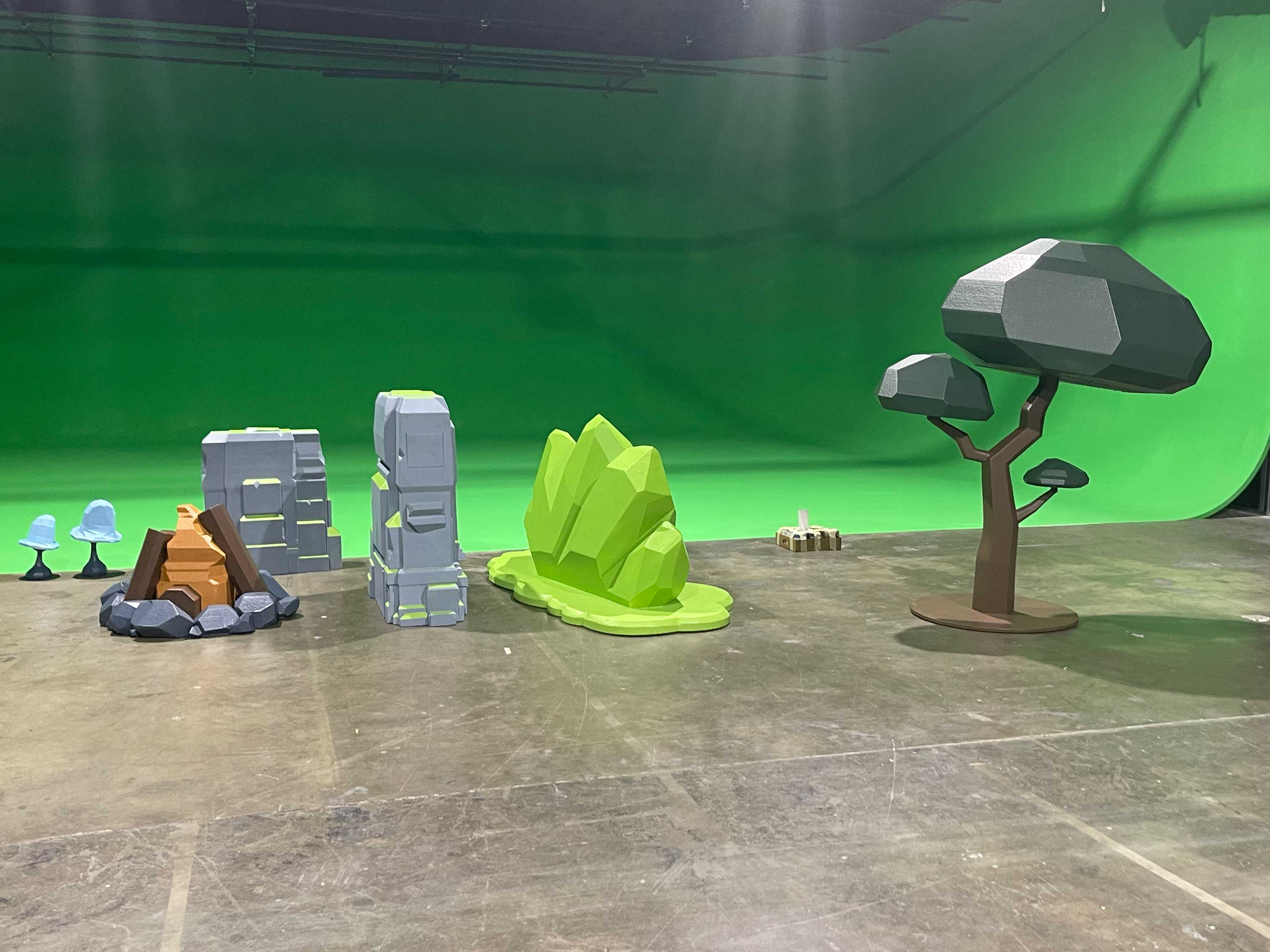 VBunny’s intro was one of the most technically intricate parts of the production, blending physical fabrication with digital world-building to create a seamless illusion of her existing inside the game. Our team built select set pieces in person, such as the stylized trees, rocks, and platform elements, to provide real lighting reference and physical grounding for her performance. The rest of the environment was constructed digitally, with 3D models, textures, and motion tracking layered in to extend the world beyond the physical frame. Every movement was carefully matched to the virtual camera path using tracking markers and previsualization, ensuring that her gestures aligned perfectly with the animated space. The result was a dynamic hybrid environment that merged handcrafted set design with precise 3D rendering, turning a simple green screen shoot into a believable, gamified entry point to the summit. The world build composition was the one with most VFX hours put into it between all the tracking and compositing.