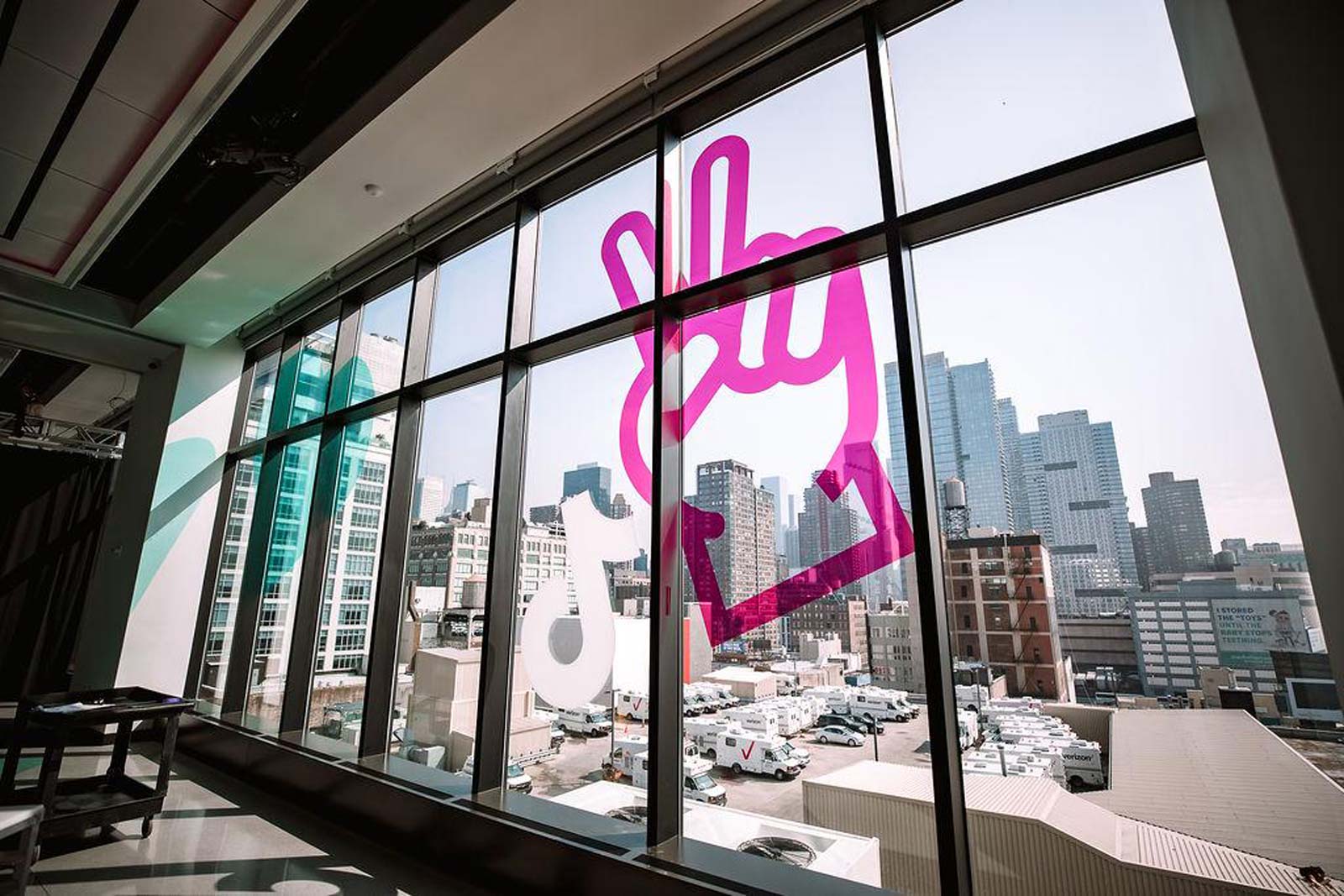 The window vinyls filled the room with color and movement. Large graphics in razzmatazz and splash stretched across the glass and shifted with the sunlight throughout the day. As the light passed through, it painted soft reflections on the floor and walls, creating a calm rhythm that changed with the city outside. The New York skyline became part of the backdrop, blending the energy of the space with the view beyond. The installation brought warmth and focus to the venue, grounding the event in its surroundings while giving it a distinct visual pulse that felt unmistakably TikTok.