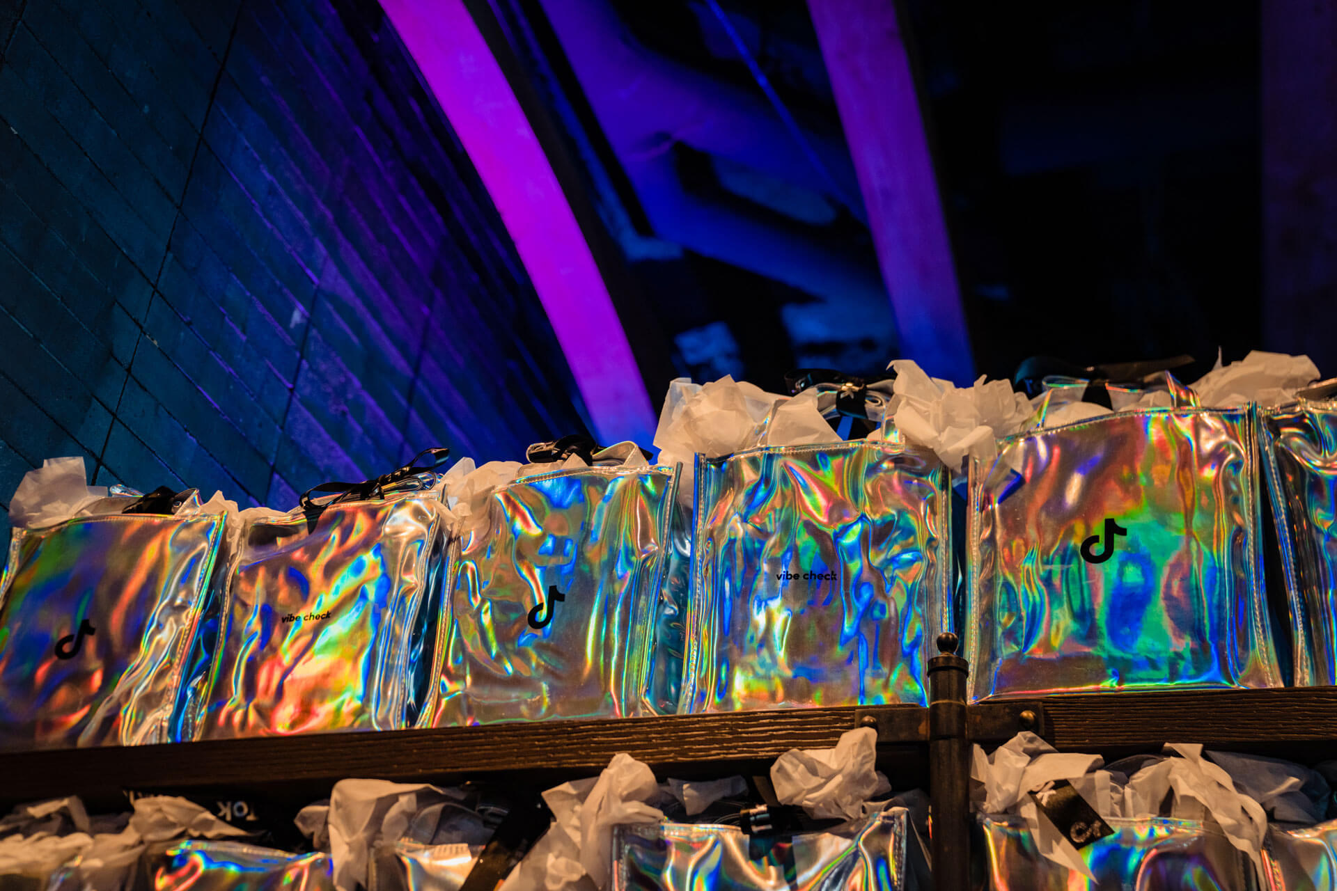 Even small details were treated as part of the design story, with holographic swag bags adding a futuristic pop of color to the venue. Their iridescent finish shimmered under neon lighting, turning giveaways into a design feature that guests couldn’t resist photographing. The intentionality extended to every touchpoint, from staging to signage, making the activation feel like a fully branded TikTok ecosystem where creativity could thrive.